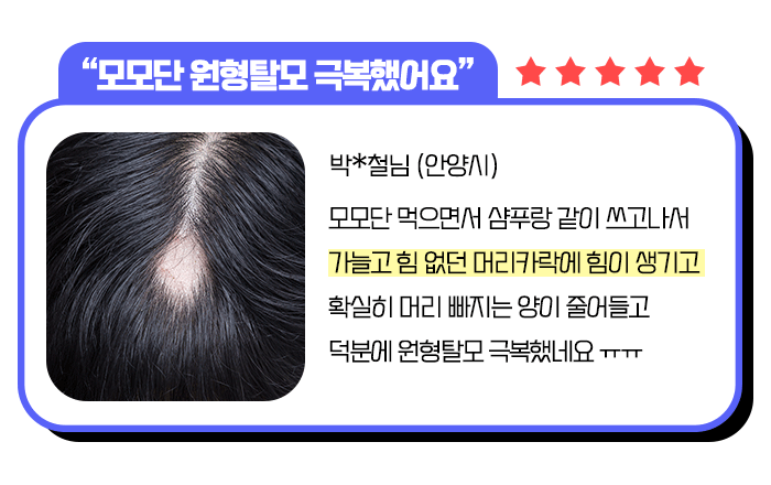 BEST 거울을 볼때마다 머리를 보면서 자신감과 자존감이 바닥으로 떨어져서 너무 우울했습니다. 모모단을 복용하고 샴푸까지 주셔서 잘 사용중인데